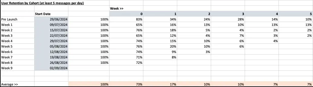 - 第 1 天:73% 的用户有互动意愿且实际尝试(发送超过 5 条消息)