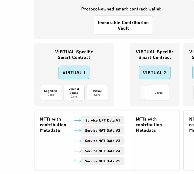 - 第四层 - 每个核心内的服务 NFT: 在每个 Virtual 智能体中,已批准的贡献以服务 NFT 的形式存储,并且这些服务 NFT 与核心之间的关系通过智能合约进行注册。